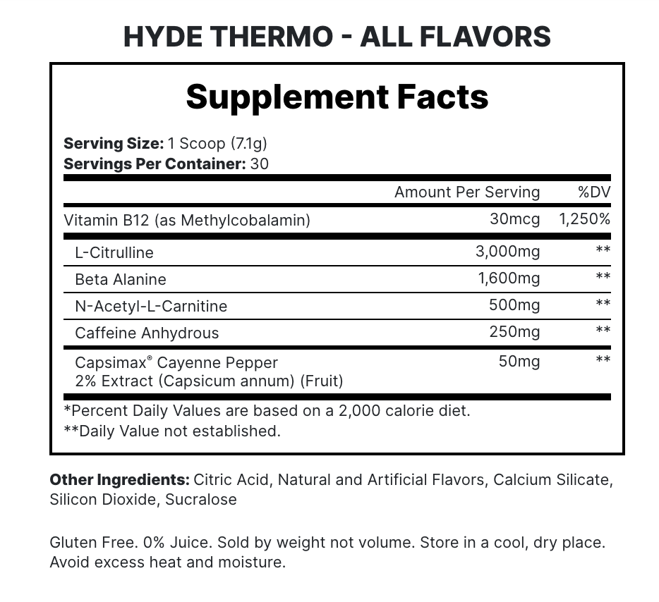 تم تطويره لمساعدتك على تحقيق أهدافك في نمو العضلات الخالية من الدهون وحرق الدهون ، يبني HYDE® Thermo ويحرق في نفس الوقت. يبدأ HYDE® Thermo بـ 50 مجم من Capsimax® ، وهو مستخلص فلفل عالي التركيز من الفلفل الأحمر الحار الذي يجلب الحرارة. كما أنه يحتوي على 30mcg من فيتامين B-12 ، و 250mg من الكافيين ، و 500mg من N-Acetyl-L-Carnitine لتركيز وطاقة لا يصدقان. مُزود بـ 3000 مجم من L-Citrulline لإنتاج أكسيد النيتريك لزيادة تدفق الدم و 1600 مجم من Beta-Alanine للمساعدة في تجاوز نقطة الإرهاق. مع HYDE Thermo ، ستبدو وتشعر وكأنك ربحت ذلك!