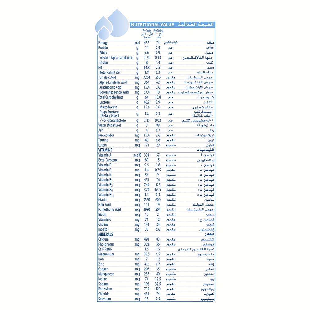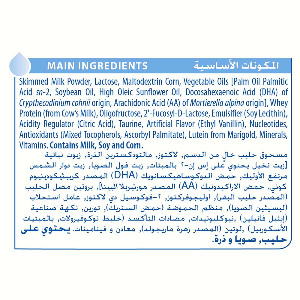 إلوما هو نتيجة أحدث بحث علمي في التغذية. تركيبته مستوحاة من الطبيعة للمساعدة على تعزيز نمو طفلك وتلبية احتياجاته الغذائية. لبناء عظام قوية، ذهن حاد وجهاز هضمي سليم، يجب أن يتمكن جسم طفلك من امتصاص واستخدام العناصر الغذائية. لهذا السبب يحتوي إلوما على الدهن النباتي اس ان2 بالميتات. هذا الزيت المفيد يساعد في امتصاص العناصر الغذائية ومركب أوليجوسكريد من حليب الأم HMO لتعزيز المناعة. إن حليب الأم هو الغذاء الأفضل للمواليد ويجب أن تستمر الرضاعة الطبيعية لأطول فترة ممكنة. استشيري طبيبك قبل استخدام هذا المنتج لمعرفة الطريقة الصحيحة لاستخدامه. غير مناسب للأطفال تحت سن 6 شهور.