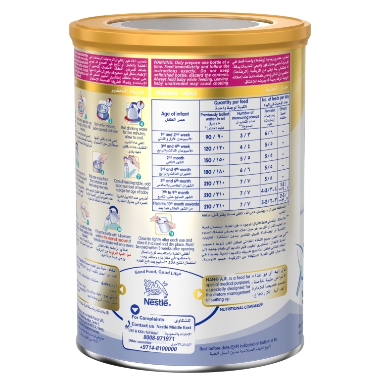 نان ايه آر هو حليب مخصص لأهداف طبية، خصيصاً لرعاية الرضع الذين يعانون من كثرة الارتجاع. نان ايه آر هو حليب مناسب كمصدر وحيد للتغذية منذ الولادة حتى سن 12 شهرًا عندما لا يتم إرضاع الأطفال رضاعة طبيعية.