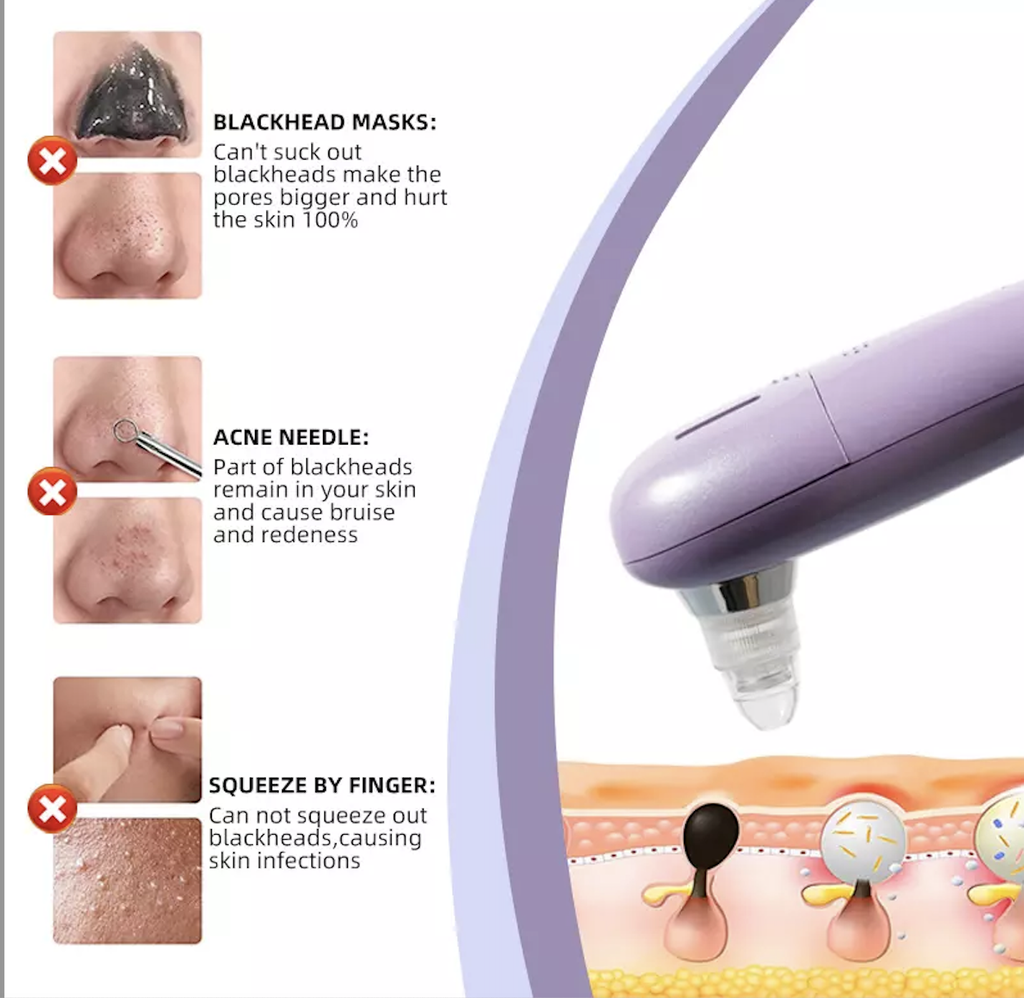 - Vacuum Blackhead Remover: The pore vacuum cleaner can solve these skin problems such as coarse pore, rough skin, dark skin, exfoliate dead skin, blackhead, pore of skin and dirt nose; lift skin elasticity and make the skin tighten through the 3 replacement suction Probes tool in different shapes