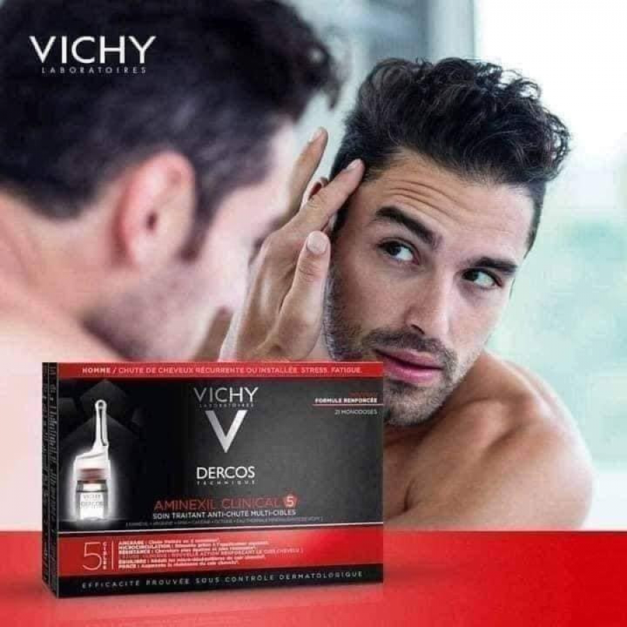 Apply Vichy Dercos Aminexil Clinical 5 Anti-Hair Loss Ampoules Men directly onto clean scalp with wet or dry hair. Apply strand by strand, massaging the scalp with the applicator in a zig-zag motion. Do not rinse. For an intensive treatment apply one ampoule per day for six weeks. For maintenance apply three ampoules per week. In case of eye contact, rinse immediately with water. Do not use on irritated scalp.