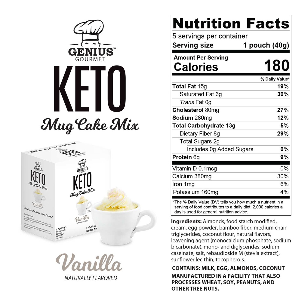 NUTRITIOUS KETO SNACKS: Energize yourself with our instant mug cakes that contain 6g of protein, 8g of fiber, and only 5 net carbs. This protein packed treat will satisfy your cravings and keep you feeling fuller longer. Each 40g pouch is made with nutritious ingredients including almonds and coconut flour, making this low-carb and gluten free mug cake nutritious as well as delicious! Each box comes with 5 single-serve pouches of Vanilla mug cake mix.