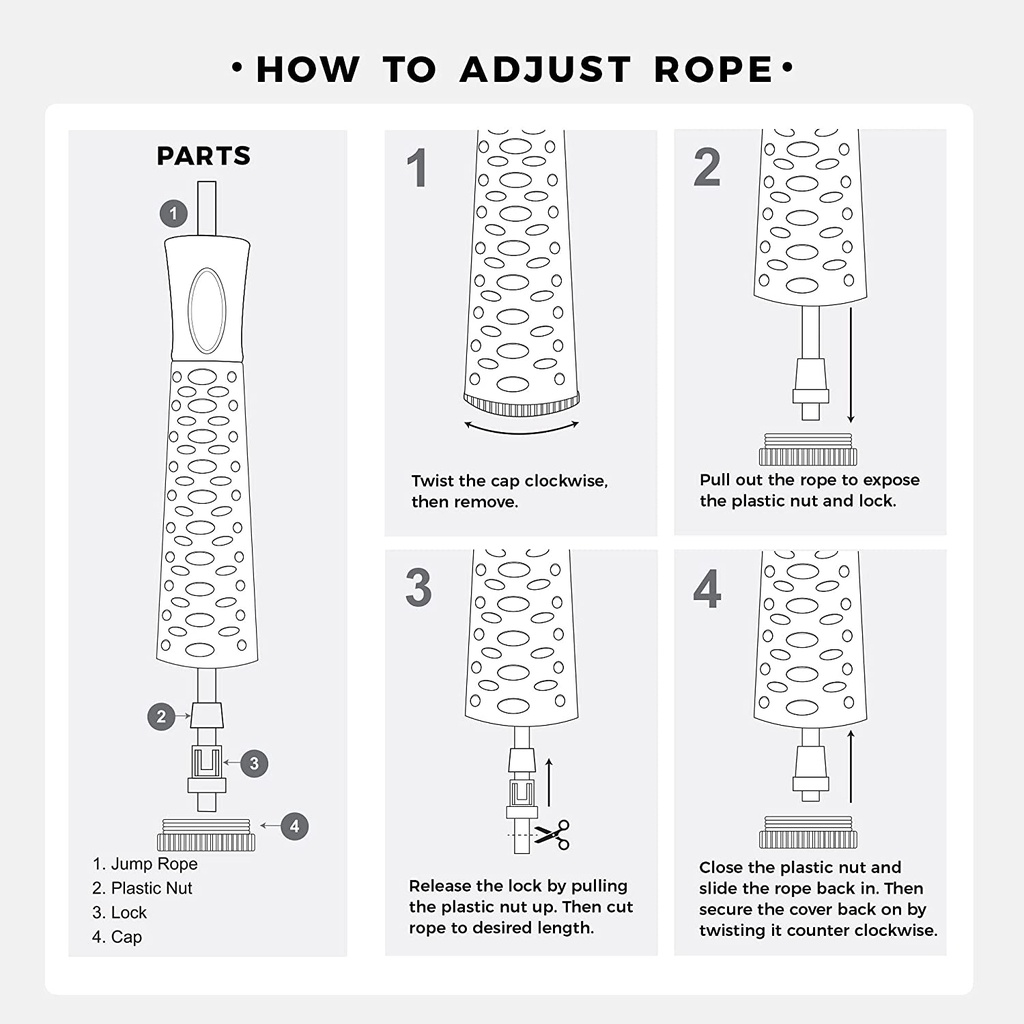 ADJUSTABLE LENGTH: The PVC rope can be adjusted to suit your height. Simply open the base of the comfort handles and cut off the desired length. Lock the cap back and get back to regular cardio training.